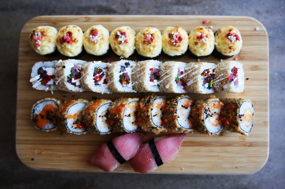 Запеченный ролл под сыром, темпура ролл под соусом Майо и Унаги, суши с тунцом, ролл в золотистом кунжуте с тунцом
