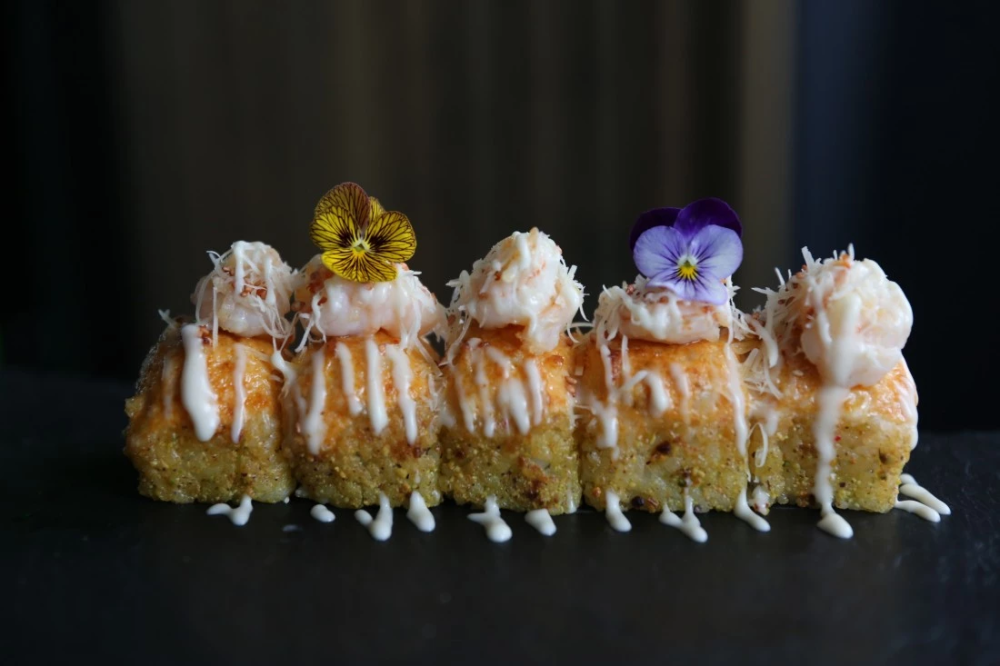 Тигровая креветка в фисташковой пудре, запеченная под сыром моцарелла и пармезан