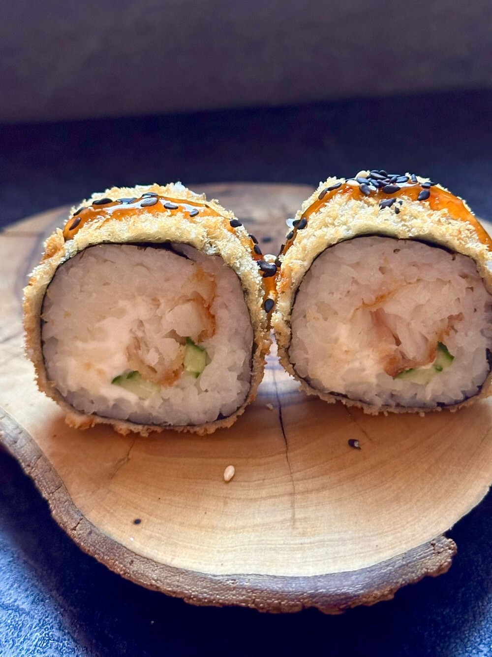 ролл темпура с окунем, огурцом и творожным сыром
