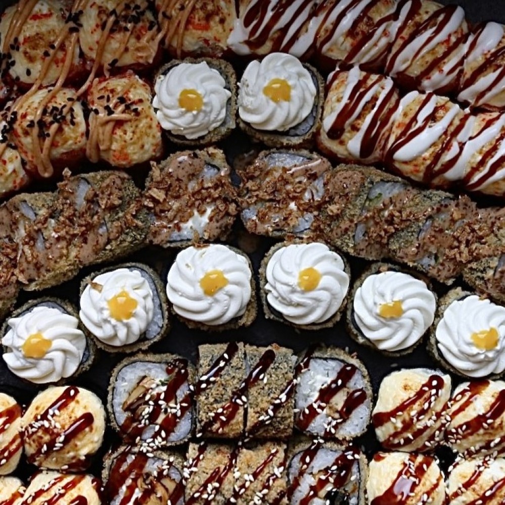 запеченный ролл с креветками, морским окунем и и цыпленком. Темпура ролл с мидиями, грибами, хрустящей моцареллой и сладким бананом