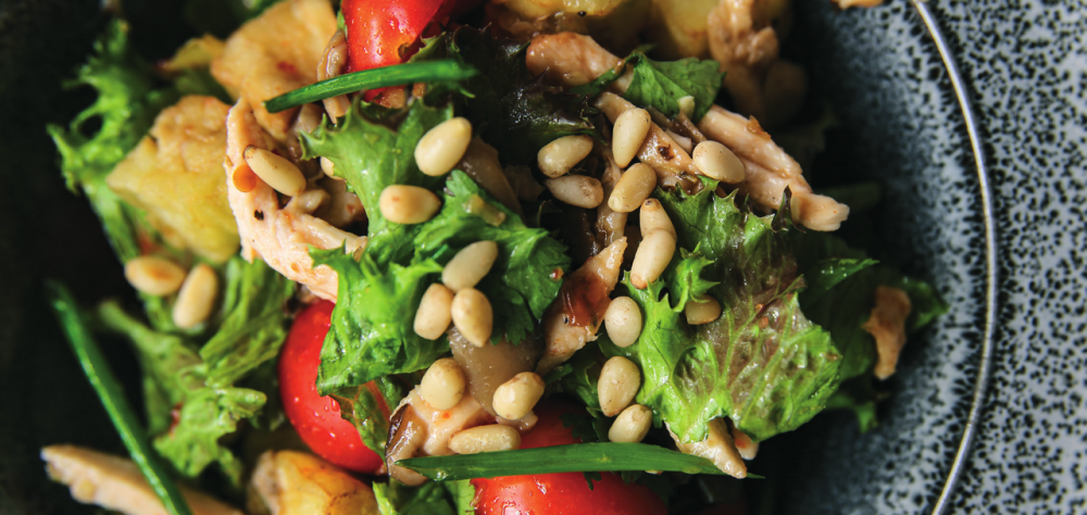 баклажаны с цыпленком и кедровым орехом в паназиатском соусе